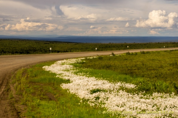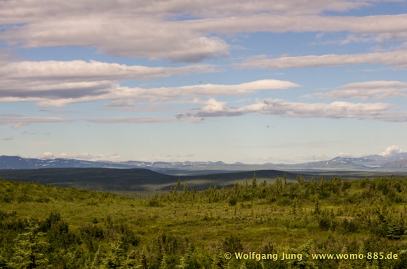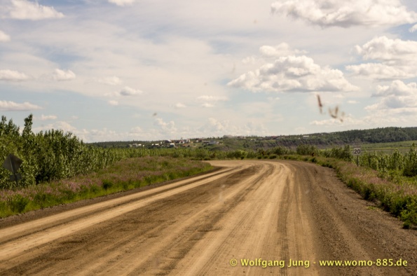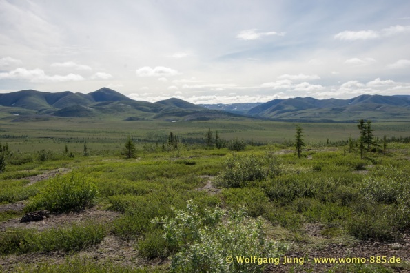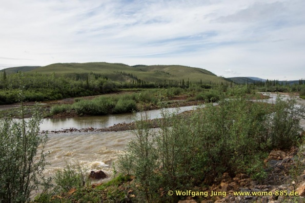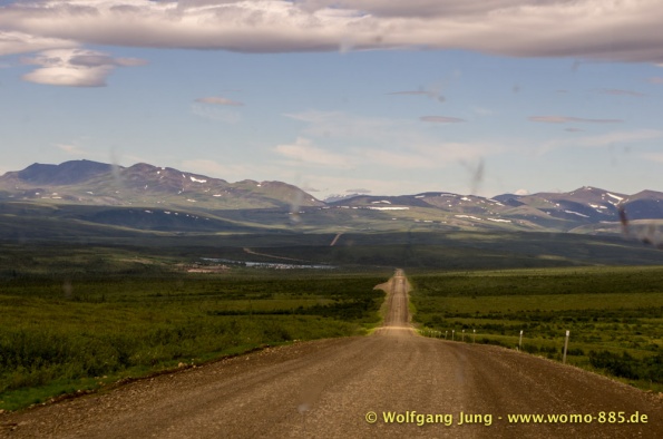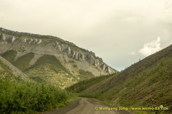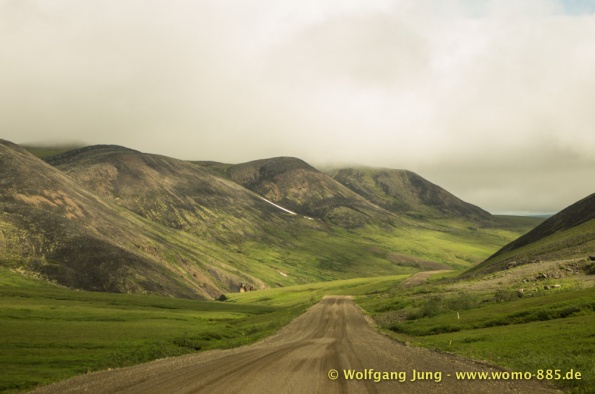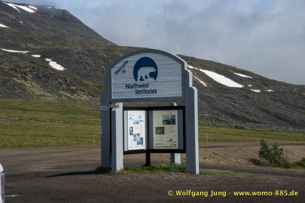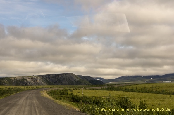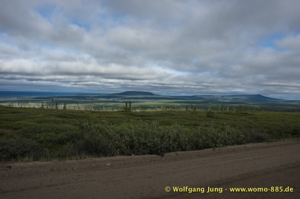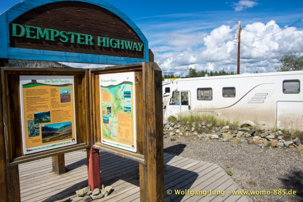 Der Dempster HWY beginnt 40 km östlich von Dawson City und führt über 734 km nach Nordwesten. Ziel ist Inuvik, die Fahrt führt durch die Ogilvie Mountains nach Eagle Plains. Hier gibt es nach 369 km eine Tankstelle mit Motel und Stellplatz. Nach weiteren gut 65 km überqueren wir den Polarkreis und kommen in die Richardson Mountains. Nach 550 km kommen wir an die Fähre des Kelly River und sind in der Mündungsebene des Mckensey River, den wir mit der zweiten Fähre überqueren. Dann kommen lange, gerade, ebene Strecken ....und dann Inuvik.