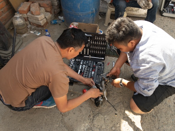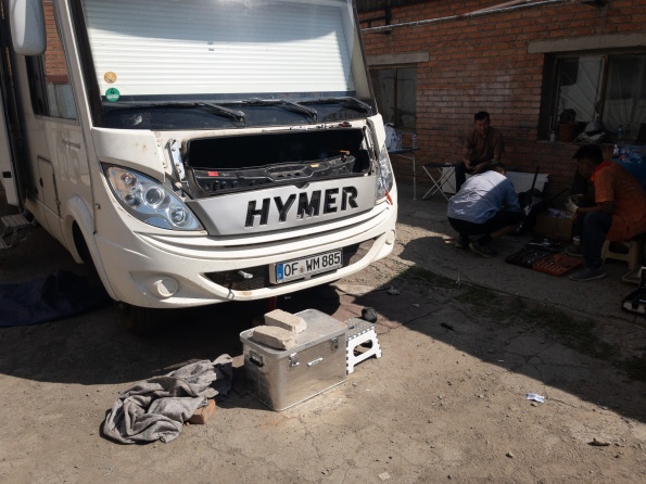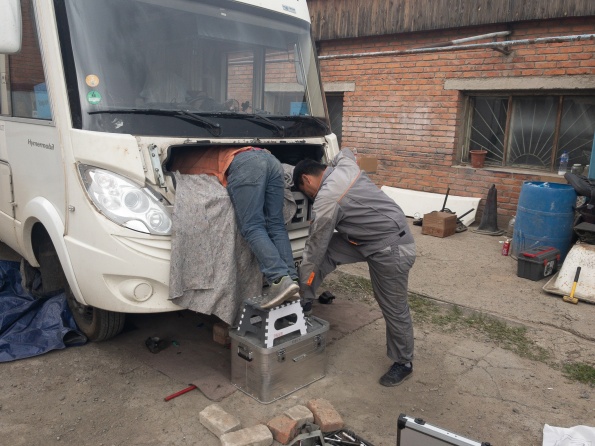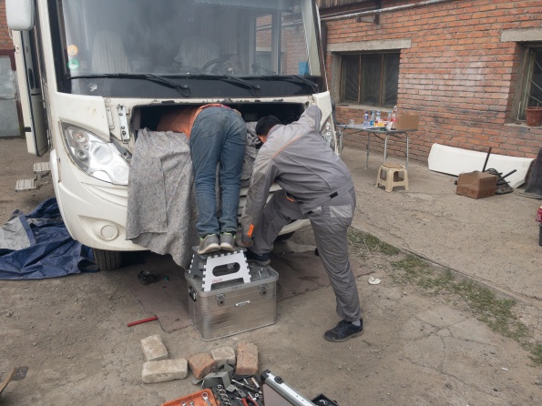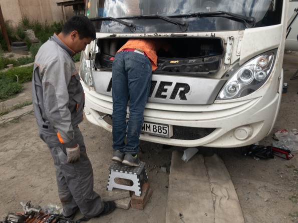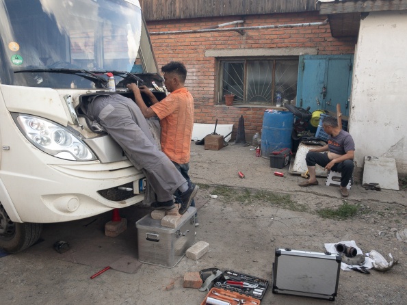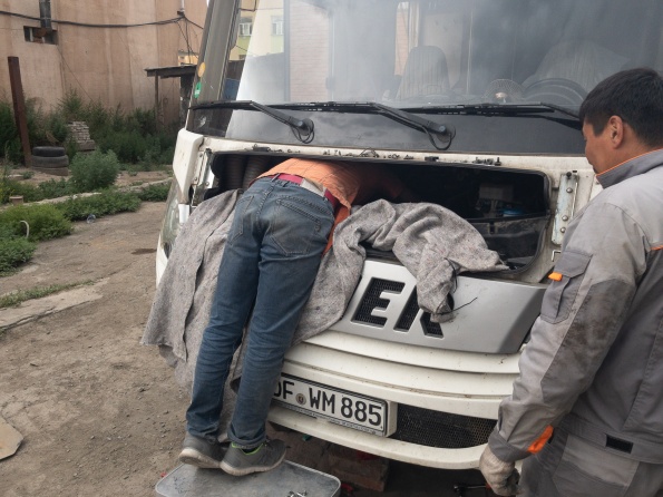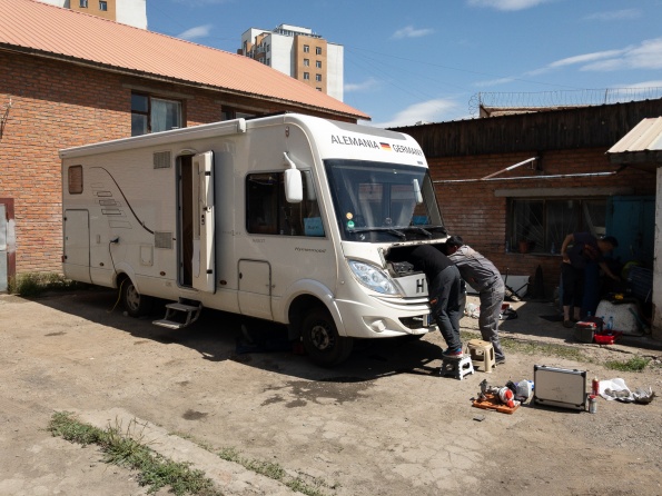 Wie im letzten Kapitel berichtet war am Donnerstag der Turbolader beschädigt worden. Freitag wurden wir nach Ulan Bator geschleppt zu Mercedes. Samstag haben wir mit Mercedes werkstattleiter gesprochen und mitgeteilt, Dass die Ersatzteile am Mittwoch Vormittag aus Deutschland kommen. Wie vereinbart waren wir am Montag um 9:30 wieder bei Mercedes, nochmal durchgesprochen, um 14:30 Fahrzeug angenommen. Mittwoch 9:00 mit Ersatzteilen bei Mercedes. Man erklärt uns, es täte Allen leid, aber sie könnten uns nicht helfen, um17:00 schließt die Werkstatt wegen Naadam für 5 Tage. Wir beginnen zu telefonieren und fahren 6 Stunden durch Ulan Bator um einen Platz zum reparieren zu finden. Um 18:00 kommt ein Abschlepper zu Mercedes und schleppt uns zum neuen Platz. Wir müssen rückwärts in den Hof, haben aber keine Abschleppstange, um 20:30 war das WOMO trotzdem im Hof. Donnerstag kamen neben Tsyren noch Ochir, Wada und sein Bruder, dann ging die Demontage los. Nach 10 Stunden fehlten noch 6 Schrauben bis zur Demontage des Turboladers. Am Freitag feierten Alle Naadam, Samszag morgen ging es weiter. Dank Armins werkzeug war nach weiteren 2 Stunden der Turbolader demontiert, 6 Stunden später der neue Turbolader eingebaut, Motor lief, Reparatur erfolgreich beendet. Alle haben bei ca. 45 C im Motorraum geschraubt, ohne Zeichnung, aber mit Können, Übersicht und Einsatz, eine für mich unglaubliche Leistung vollbracht...Einfach Super....