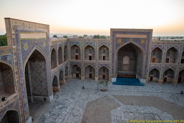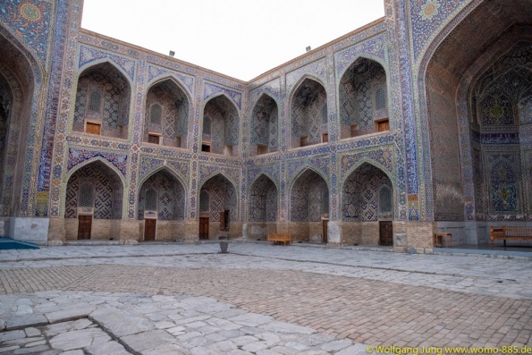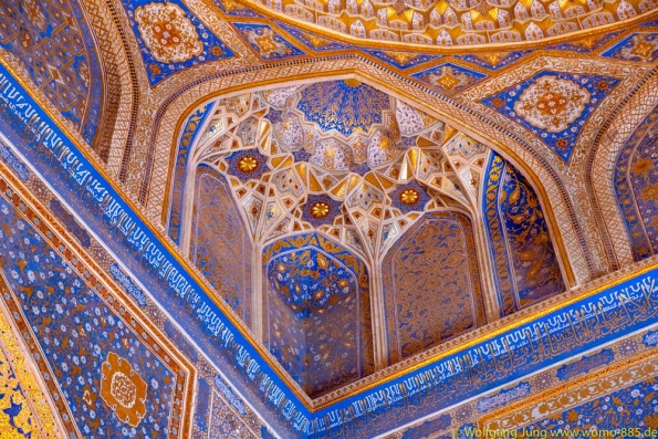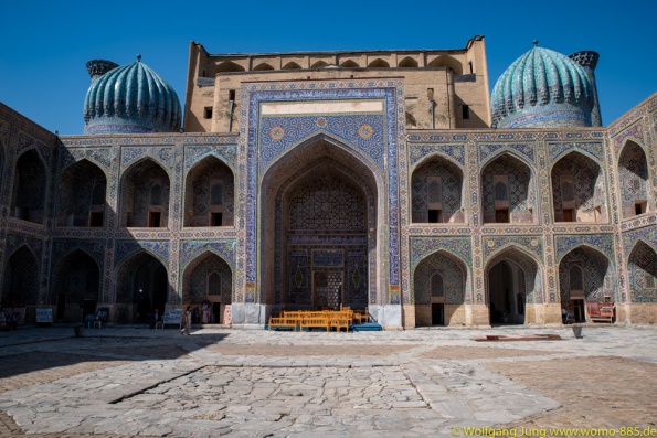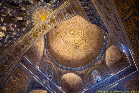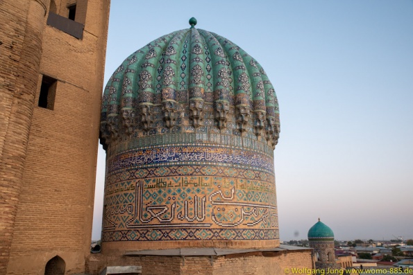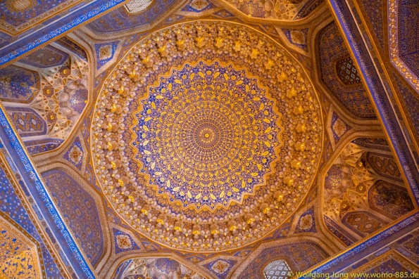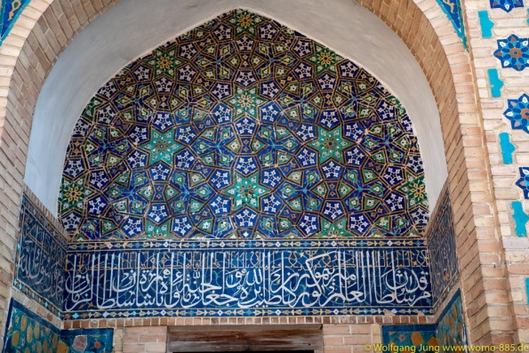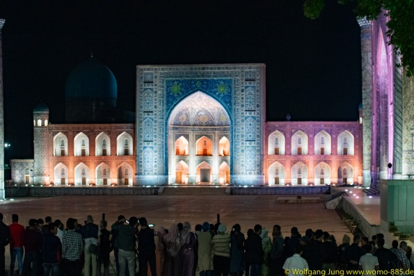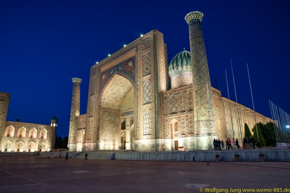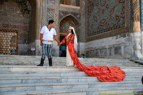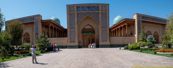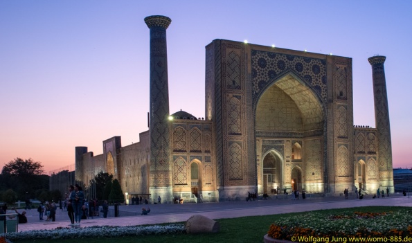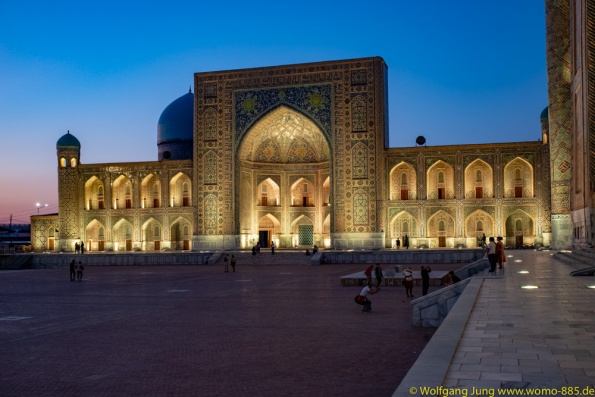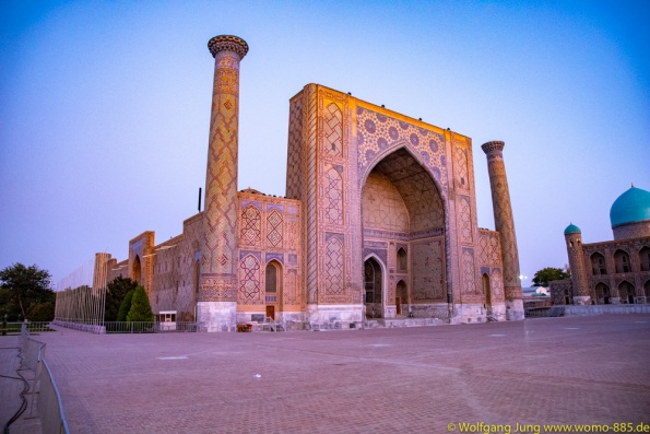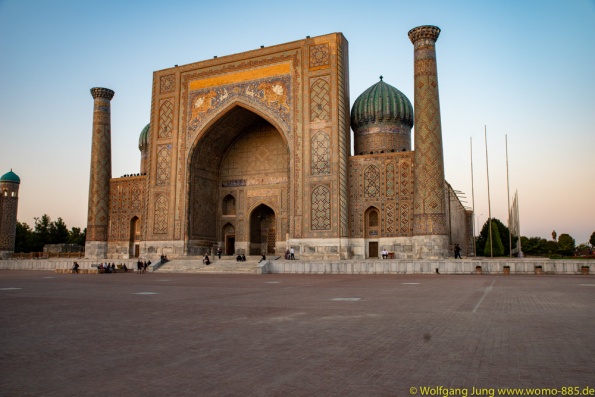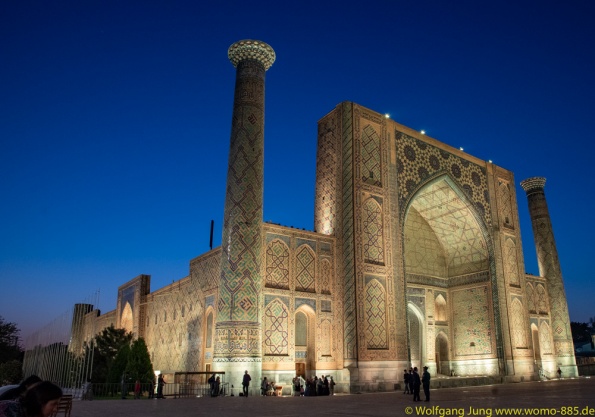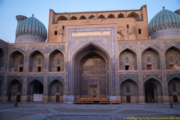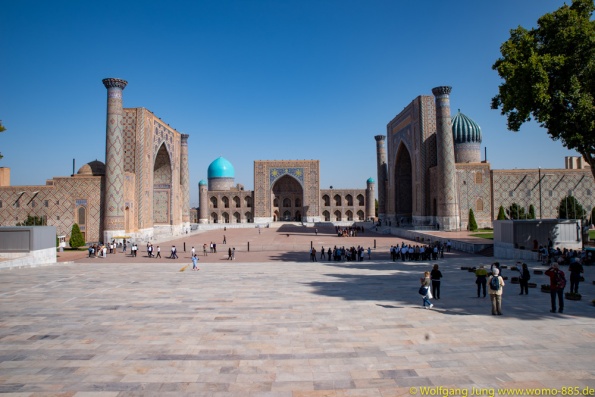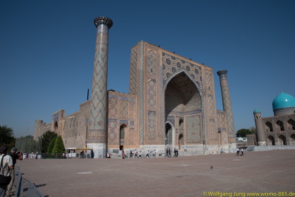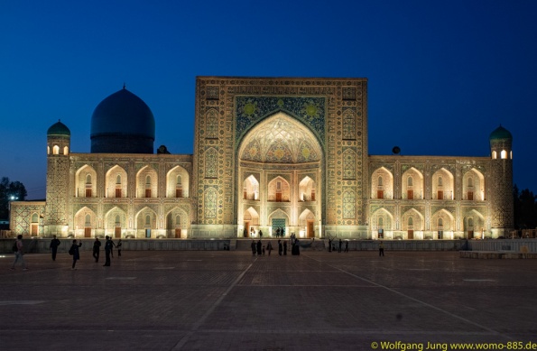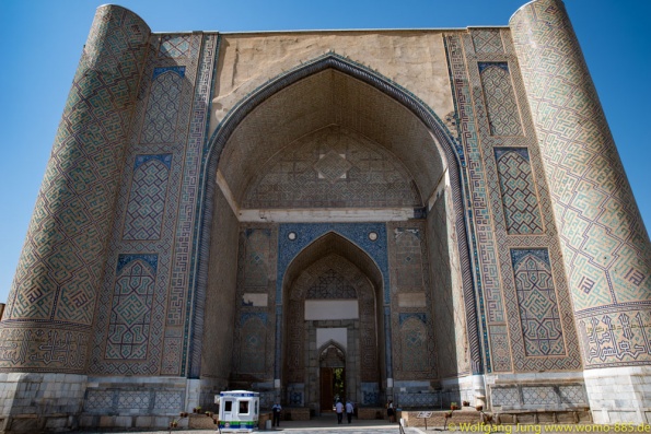 mit jedem Grenzübergang ändert sich "fast" Alles. Usbekistan ist reich an Einwohnern > 30 Mio. Erdgas ( vieles was als "russisches" Erdgas bei uns ankommt stammt von hier, Bodenschätze und nicht zuletzt Baumwolle. Vor den Mongolen gab es ein Reich von der Türkey bis Indien, einschließlich Iran und Irak mit der Hauptstadt Samarkand. Dieses Reich gründet mit und auf dem Islam. Es begründete eine Architektur die sehenswert ist. Handwerklich ein Traum. Ich zeige die Bilder mit den Namen die ich behalten habe....für Alles weitere gibt es Reiseführer, etc.....Meine sehr ausführliche fotografische Dokumentation des Registanplatzes bringt meine Verehrung für dieses Meisterwerk zum Ausdruck...