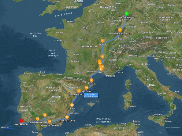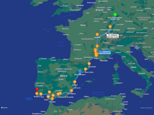 Nach Coronaimpfung, Behebung meiner Zahnprobleme, fahren wir nun der herbstlichen Sonne des Südens entgegen. Die geplante Route könnt ihr dem Bild entnehmen. Wir sind bereits einige Zeit unterwegs und stellen nun die ersten Bilder ein. da wo der "Blaue PIN" ist sind wir mal gewesen. Das zweite BIld zeigt die IST_ROUTE bis Portugal.