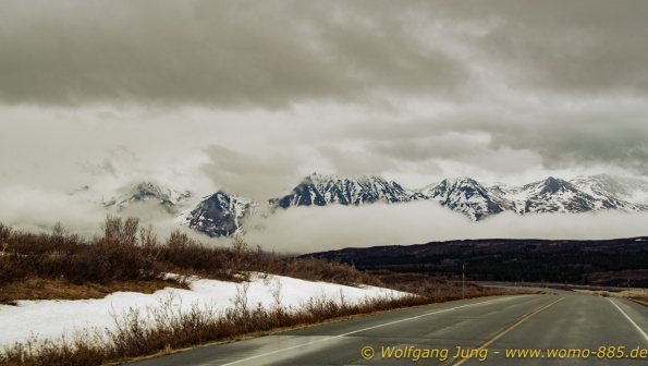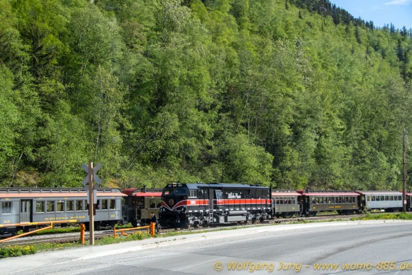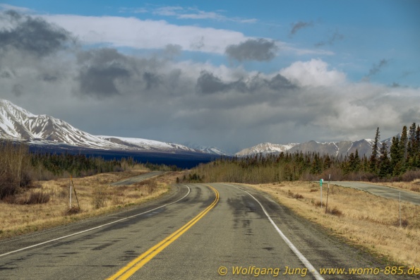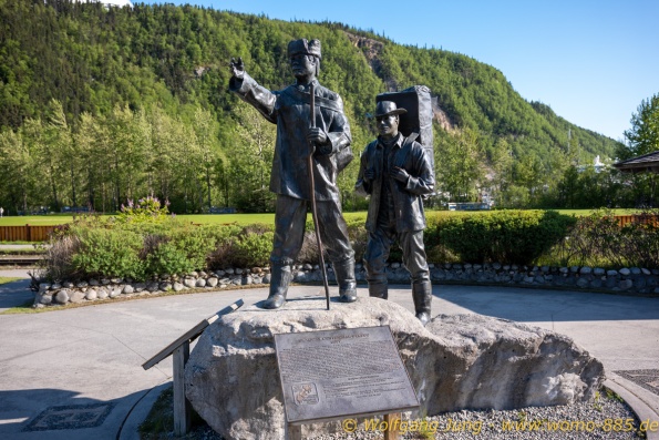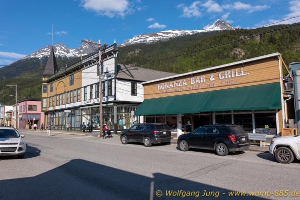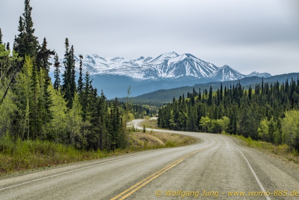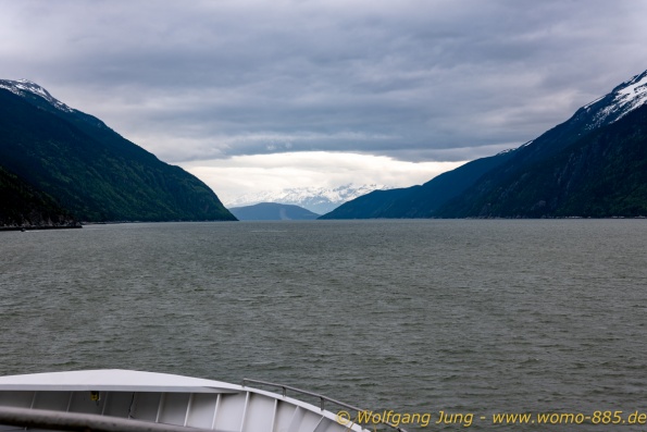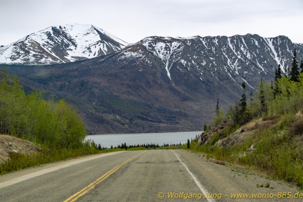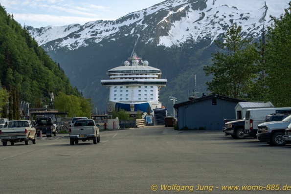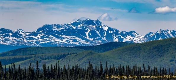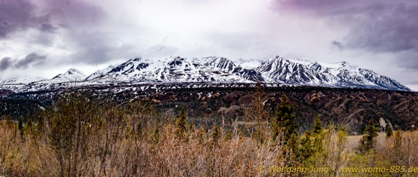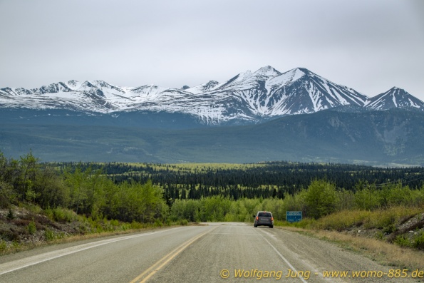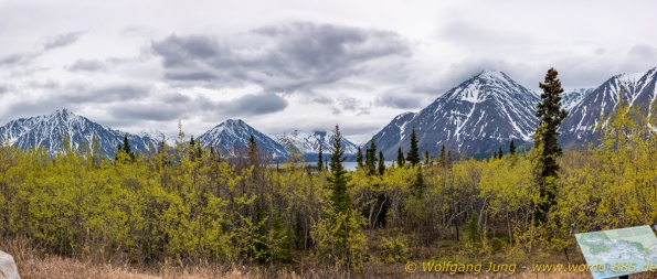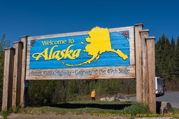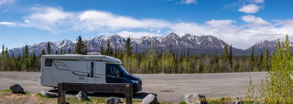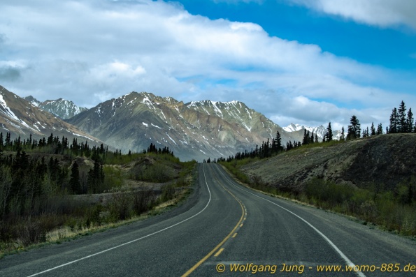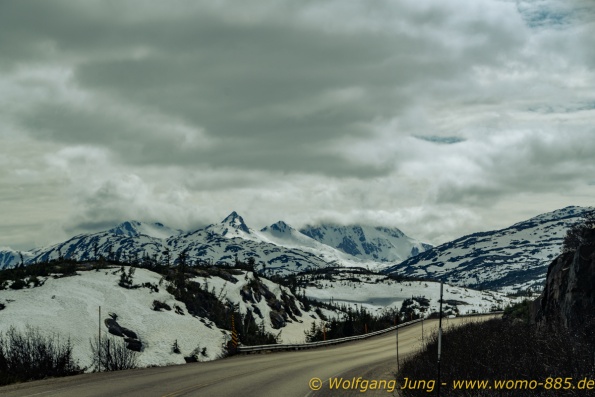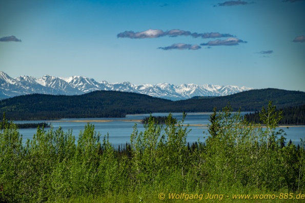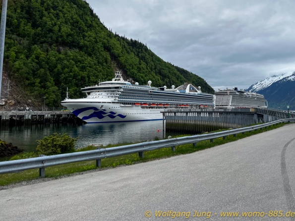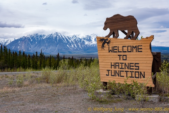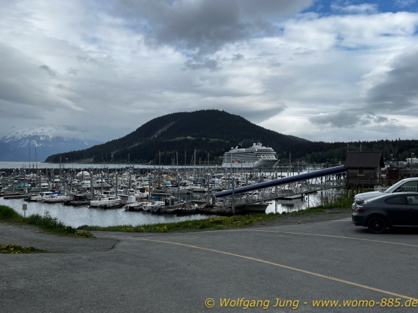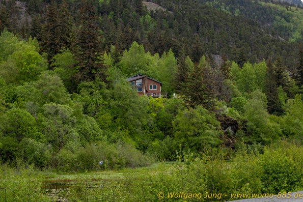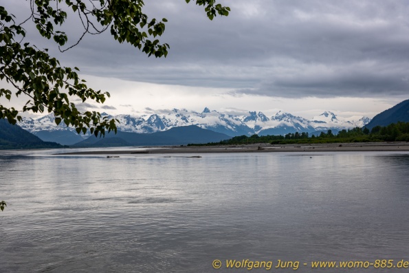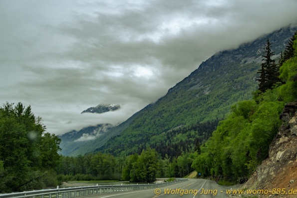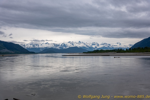 Von Whitehorse nach Skagway, AK über den Whitepass eine sehr schöne Strecke. Die ist Anziehungspunkt für die vielen Kreuzfahrer. Im Goldrausch von Dawson kamen hier 1897 tausende von Glückssuchern an und Alle waren zu spät, der Kuchen längst verteilt. Wir fahren mit der Fähre 20 km nach Haines. Von hier folgen wir nun 3 Tage erst dem Haines Hwy, dann dem Alaska Hwy. Diese führen entlang des Verbundes der National Parks - Glacier Bay - Kluane - Wrangel St. Elias - nach Nordwesten. Über 700 km entlang schneebedeckter Gipfel .......