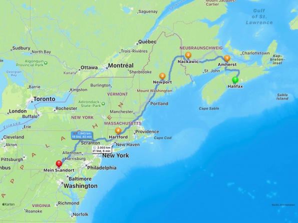 Es war Alles etwas überraschend. Flug am 27.3. wg. Streik ausgefallen. Am 28.3. erfahren wir um10:00, das um 13:55 geflogen wird. In Toronto gibt es keine Anschlussflüge nach Halifax. Mit viel Gerede und Verständnis, 29.3. erster Flug 7:00. Wir bleiben im Flughafen und sind um 10:00 in Halifax. Bis 12:00 haben wir Alle Papiere und Stempel und stehen vor unserem wohlbehaltenen WOMO. Die erste Nacht geht es in ein Hotel. Dann umpacken und losfahren. Wir wussten das hier nd in den Neuenglandstaaten die Saisin erst am 1.Mai beginnt....also fahren wir nach Süden....
