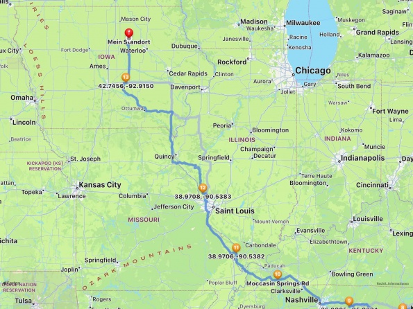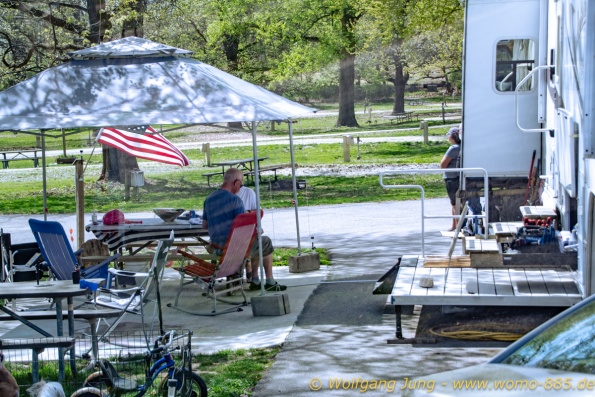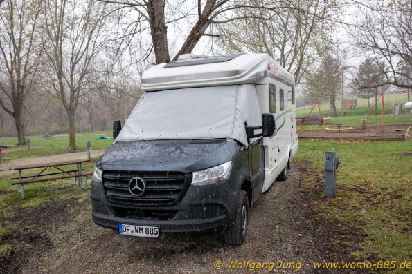 wir standen südlich von St.Louis am großen Fluss. Nun durchqueren wir St. Louis und fahren zu einem State Park nördlich. Ein sehr schöner Platz oberhalb der Hochwasserlinie. Ein kurzer Spaziergan führt an den Mississippi. Am nächsten Morgen fahren wir in die Nähe von Des Moines, Iowa. Freitag sitzen wir bei +28 C im Freien. Margit wäscht erstmals, ich nutze das Internet und wir machen Haushalt. als wir am Sonntagmorgen weiter fahren hat es +1 C und Schnee. So schnell geht das hier.