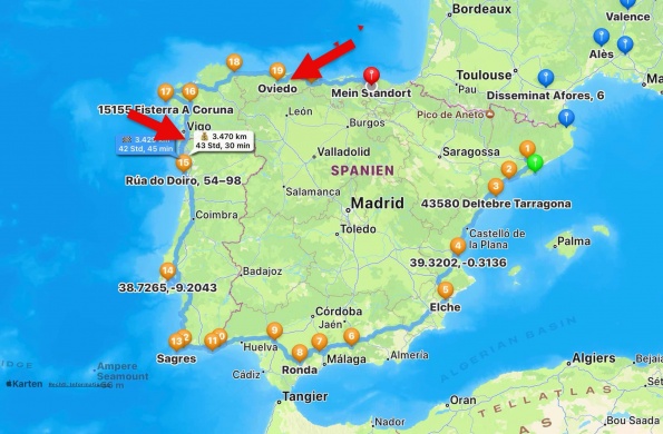 Wir sind nun in Galizien. Santiago de Compostella ist die Hauptstadt und Ziel des Jacobsweges. Über 400.000 Pilger pro Jahr brimgem die Stadt an ihre Grenzen. Das Cape Finisterre, war das Ende der Welt, als die Erde noch eine Scheibe war. In Asturien, Oviedo endet diese vorletzte Etappe.